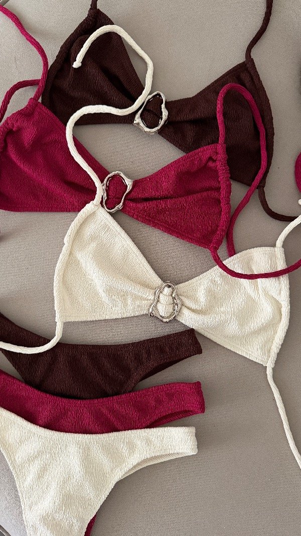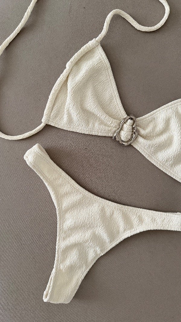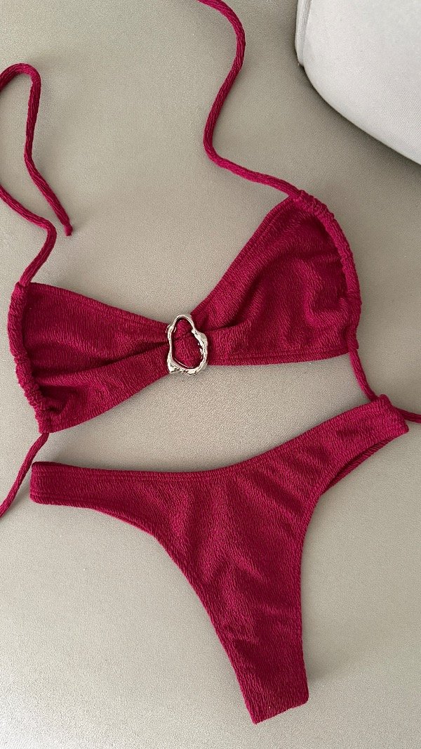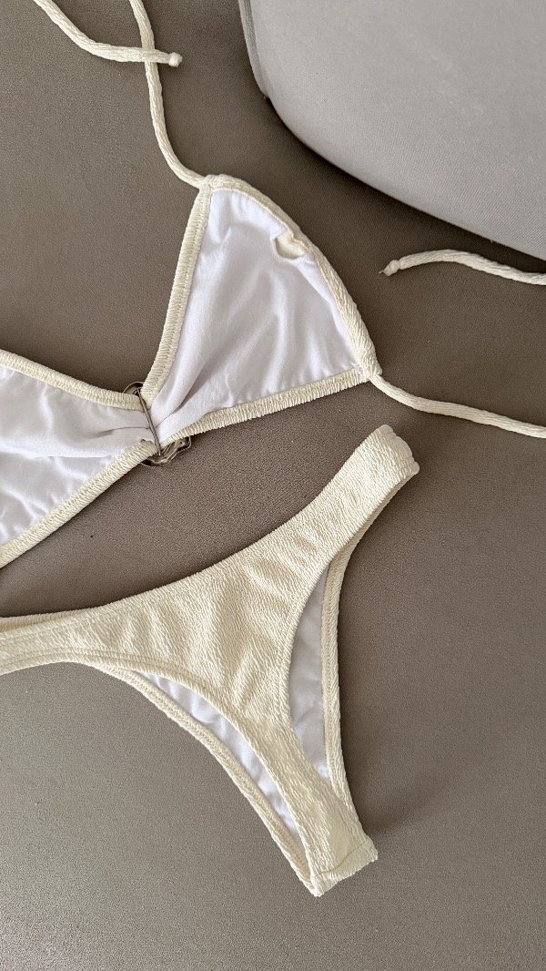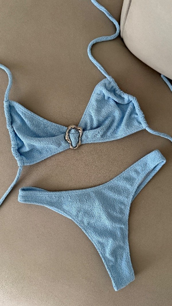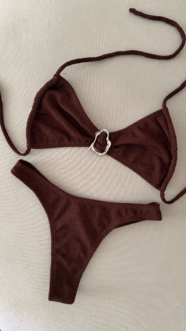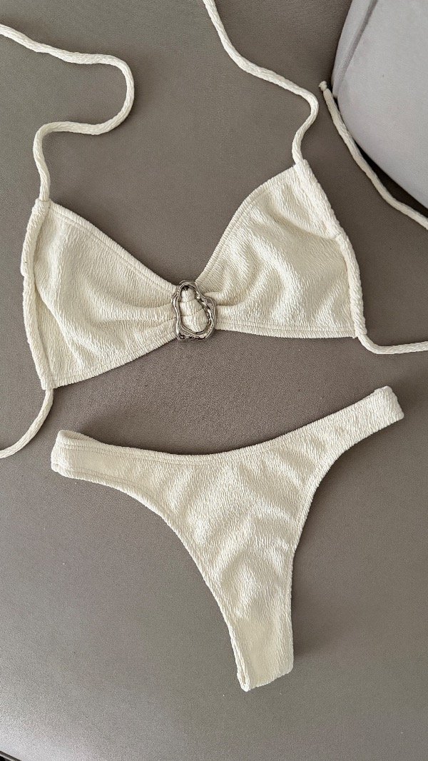Bikini texturada con detalle metálico central, top con tiras para atar. Bombi less