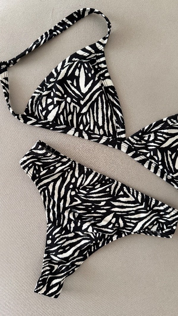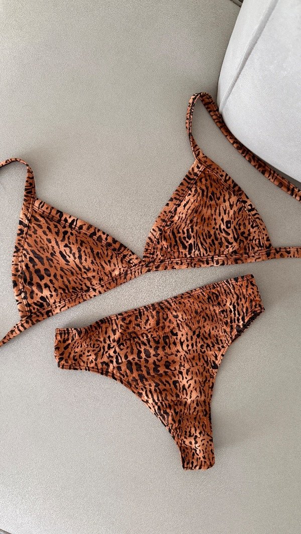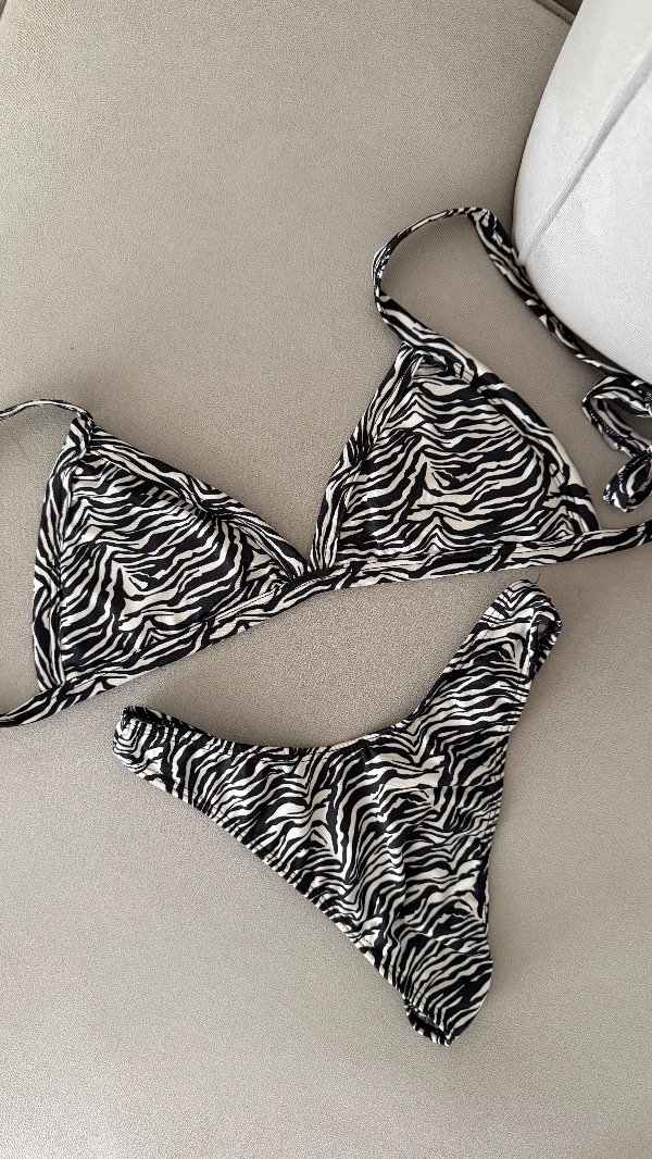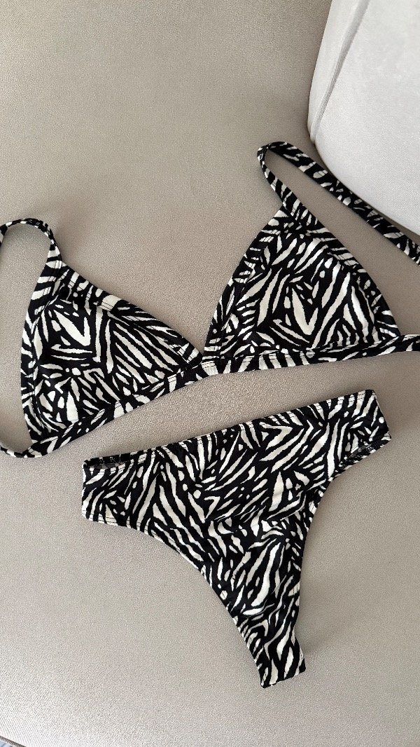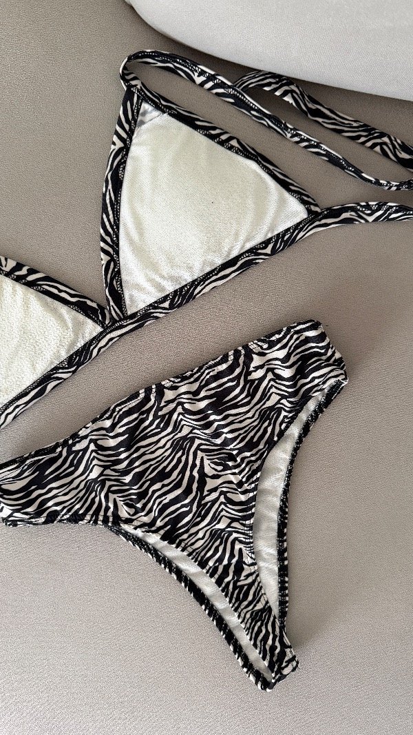 Bikini triángulo fijo con esponjita desmontable. Espalda para atar. Bombi less tiro alto, talle único abarca 38