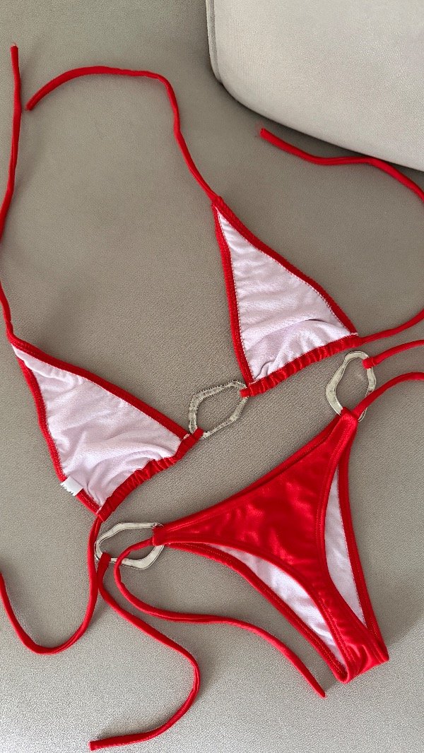 Bikini triangulo alto, forrada, con tiras para atar. Bombi less para atar. Si preferis que te tape mas, podes pedirte un talle más del que uses normalmente.