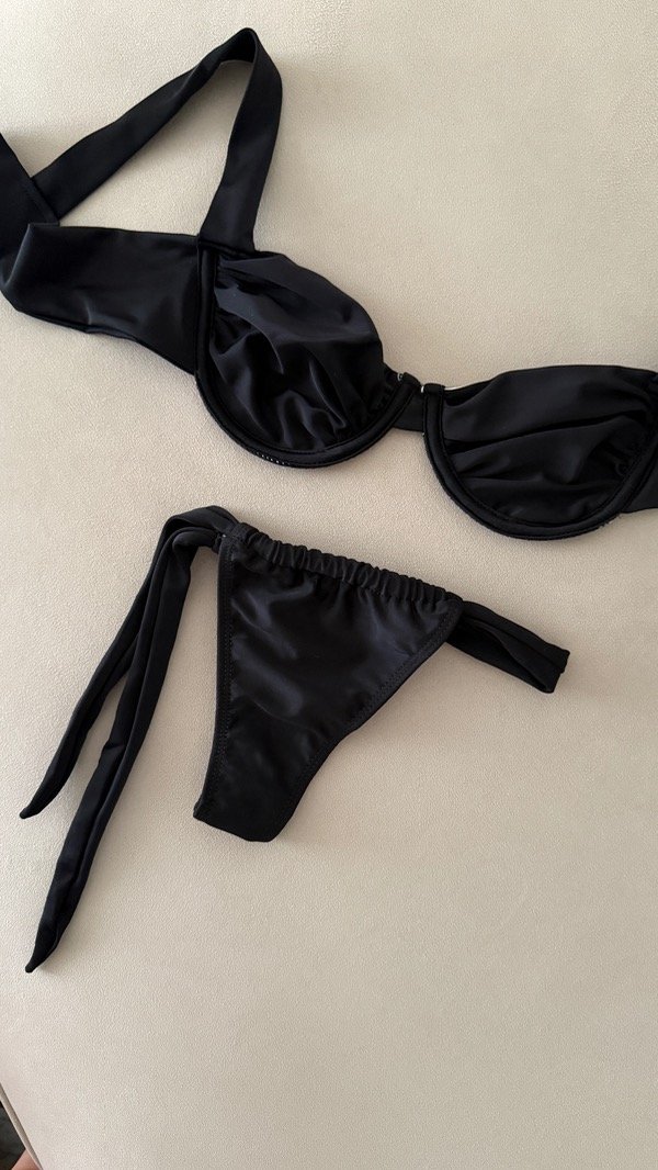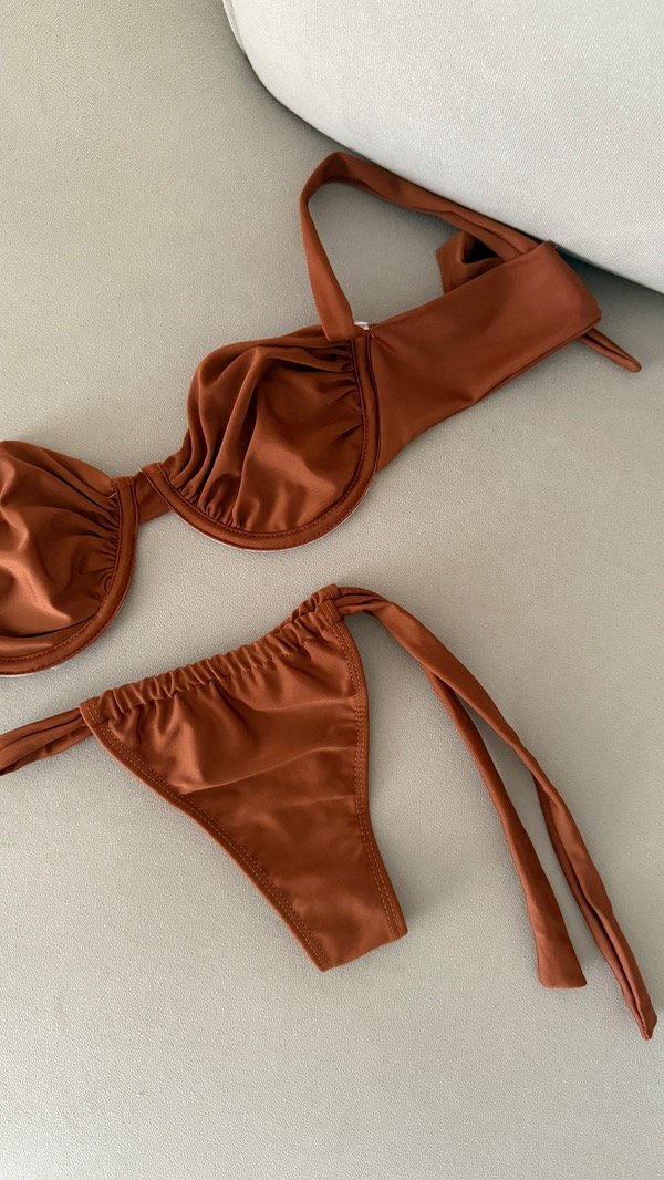 Bikini con aro. Breteles fijos, tiras para atar en espalda. Less con frunce para regular parte delantera y trasera, regulable para atar de un lado.