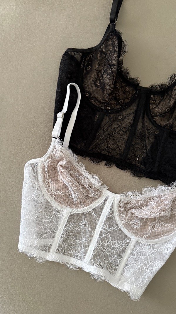 Bustier de encaje con aro, tazas forradas. Breteles regulables y espalda ajustable con cinta