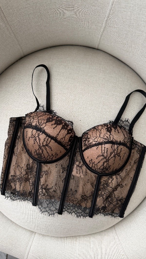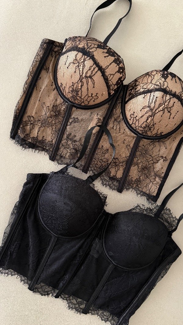 Corset premium, de encaje floral negro con base nude/base negra forrado en microtul para mayor confort y mejor estructura.