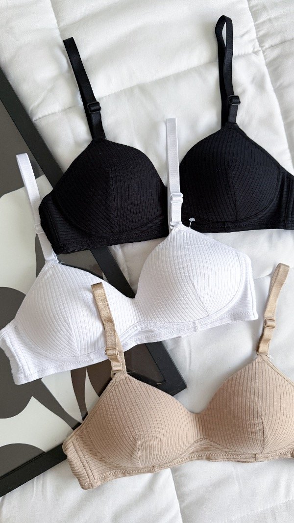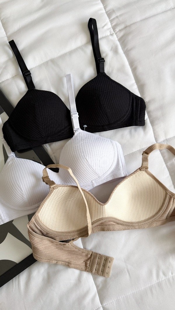 Corpiño importado de algodón, con tazas (sin relleno). Breteles regulables y desmontables con avios de plástico. Espalda con 3 niveles para abrochar. Talle 85 al 105